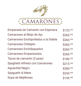 Disfruta desde nuestros clásicos Camarones al Mojo de Ajo, Enchilpayados, a la Diabla o Chiltepín, hasta opciones como Aguachile Negro, Ceviche y Carpaccio de Salmón, o una reconfortante Sopa de Mejillones.